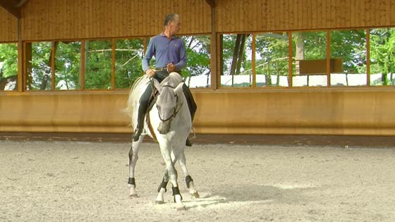 Oft nehme ich als Ausgangspunkt die körperliche Beschaffenheit des Pferdes, und zwar mit dem Ziel, es in der Folge in eine mentale Disposition zu versetzen, die für die qualitative Arbeit günstig ist. Ich beginne beispielsweise mit dem Lösen an der Longe. Ohne Reiter auf dem Rücken kann sich das Pferd frei bewegen und seinen Körperzustand organisieren, um mit seinem Körper bei der Arbeit unter dem Reiter verfügbarer zu sein.